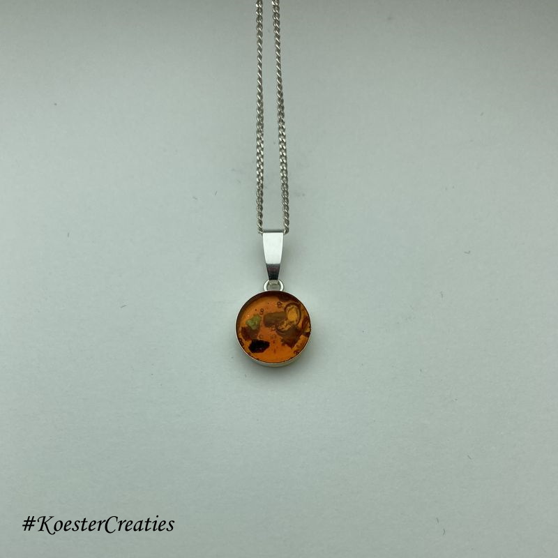 Het hangertje op de foto werd gevuld met crematie-as en barnsteenimitatie-hars.