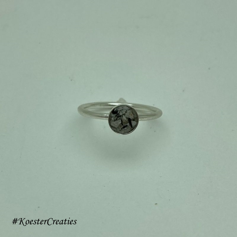 Deze kwaliteitsvolle elegante ring van sterling zilver heeft een kastje met een diameter van 6mm. Dit kastje vullen we voor jou met een plukje haar. De haartjes worden zichtbaar verwerkt in een harskleur naar keuze.